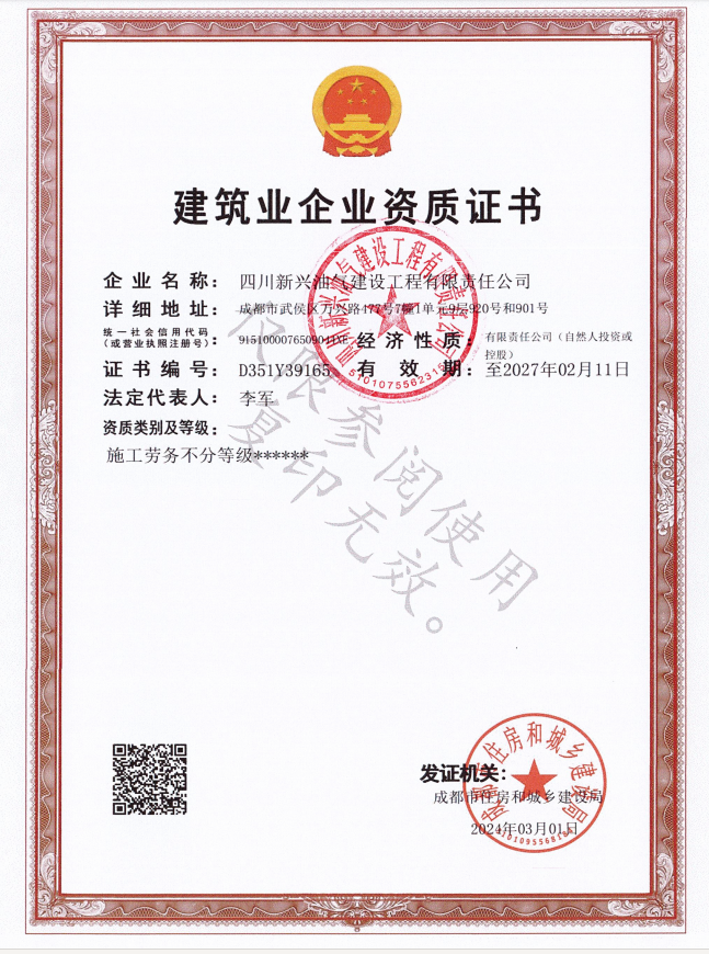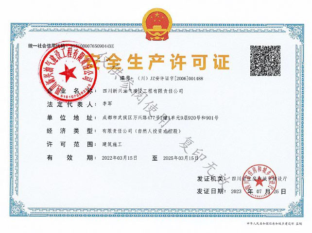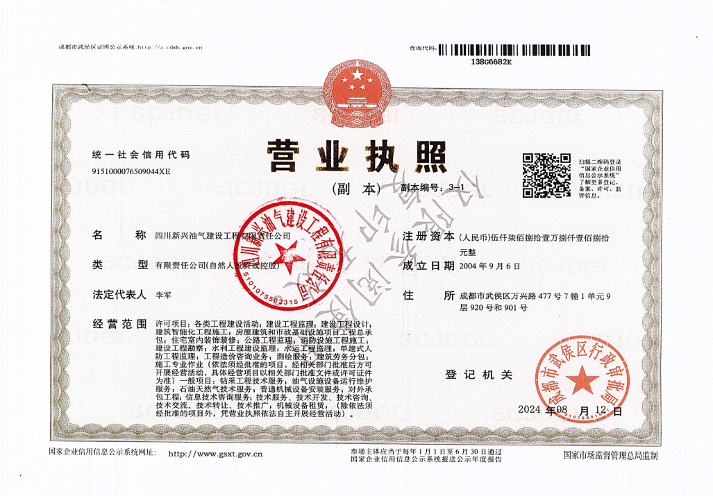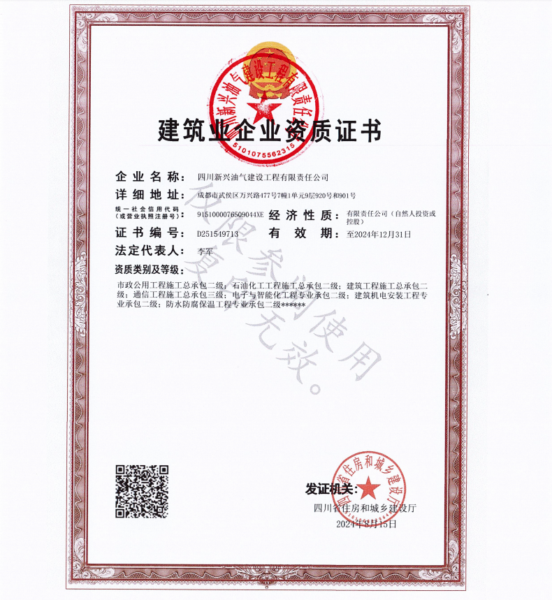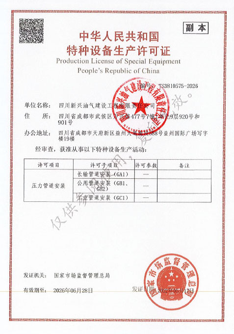 四川新兴油气建设工程有限责任公司成立于2004年9月,注册资金63180万元,目前具有石油化工工程,建筑工程、市政公用工程及通信工程施工总承包乙级和建筑机电工程,防水防腐保温工程专业承包乙级资质和长输管道GA1级、GA2级;公用管道GB1、GB2级;工业管道GC1级特种设备生产许可。